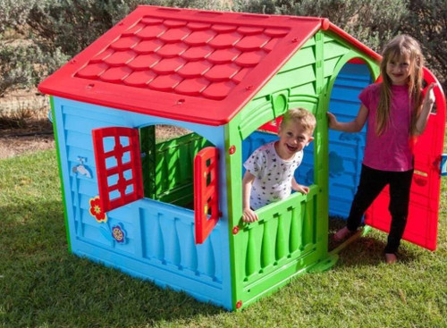 The House of Fun Playhouse is made from UV-resistant, high-quality, durable material. It contains a look-out balcony, clock, and letterbox.